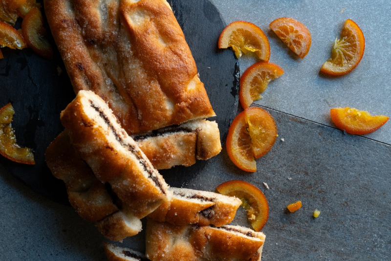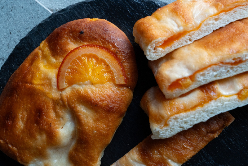 Coca de mantega farcida de deliciosa crema de xocolata i daus de taronja.